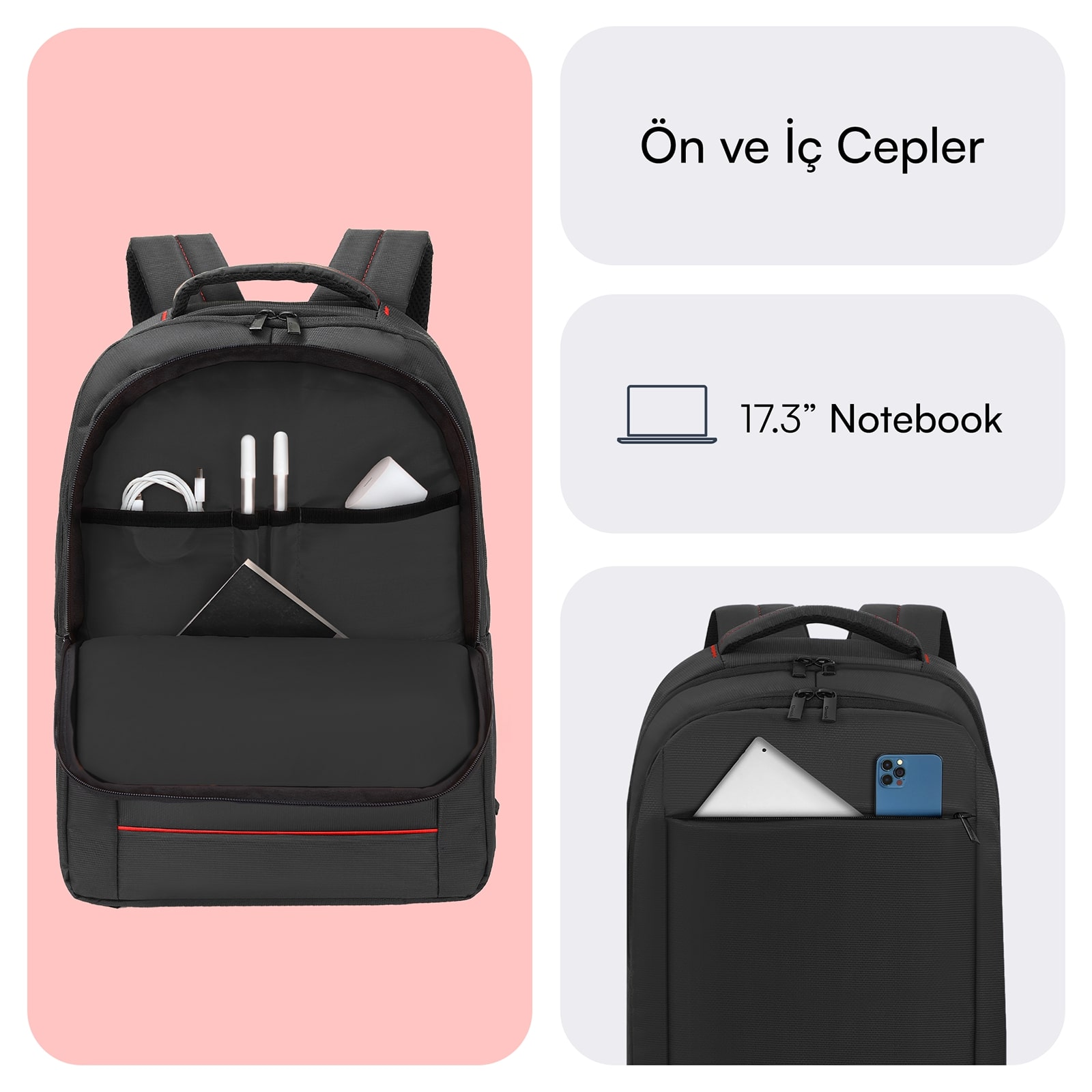 Önde 1 adet organizasyon bölümü ve 1 adet fermuarlı ön cep